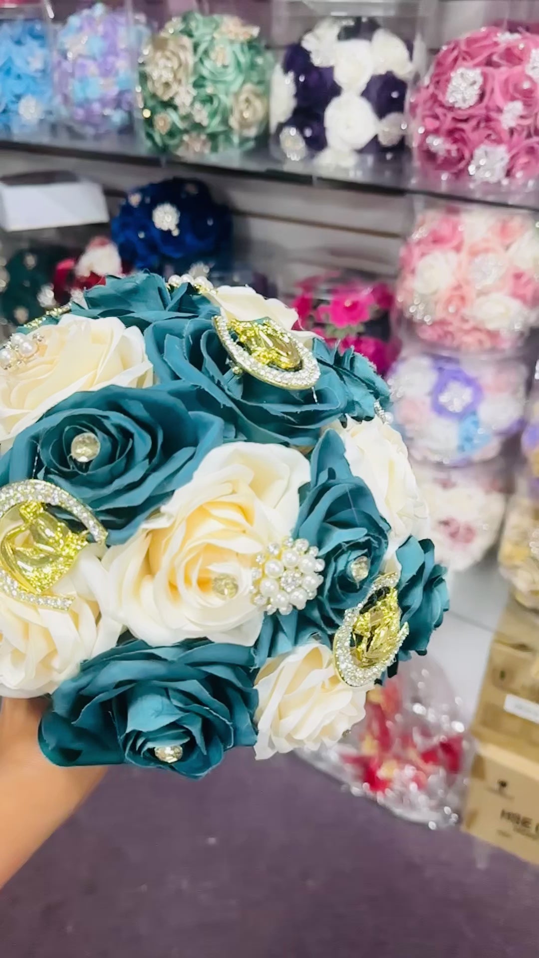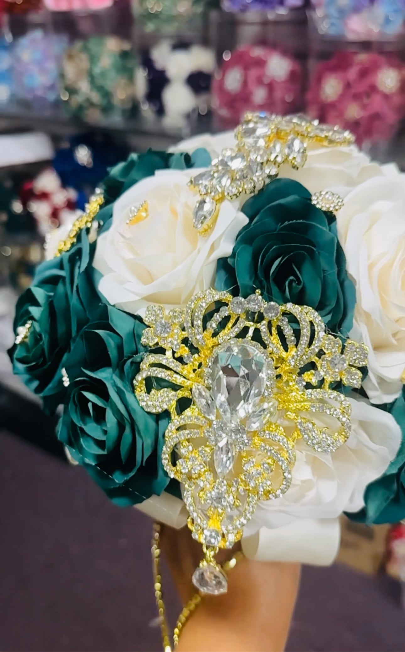 Crafted with expert precision, this custom quinceañera bouquet boasts beautiful silk flowers in a hunter green, ivory, and gold color scheme. Adorned with elegant brooches, it adds the perfect touch of sophistication to any special occasion. Elevate your celebration with this stunning bouquet.