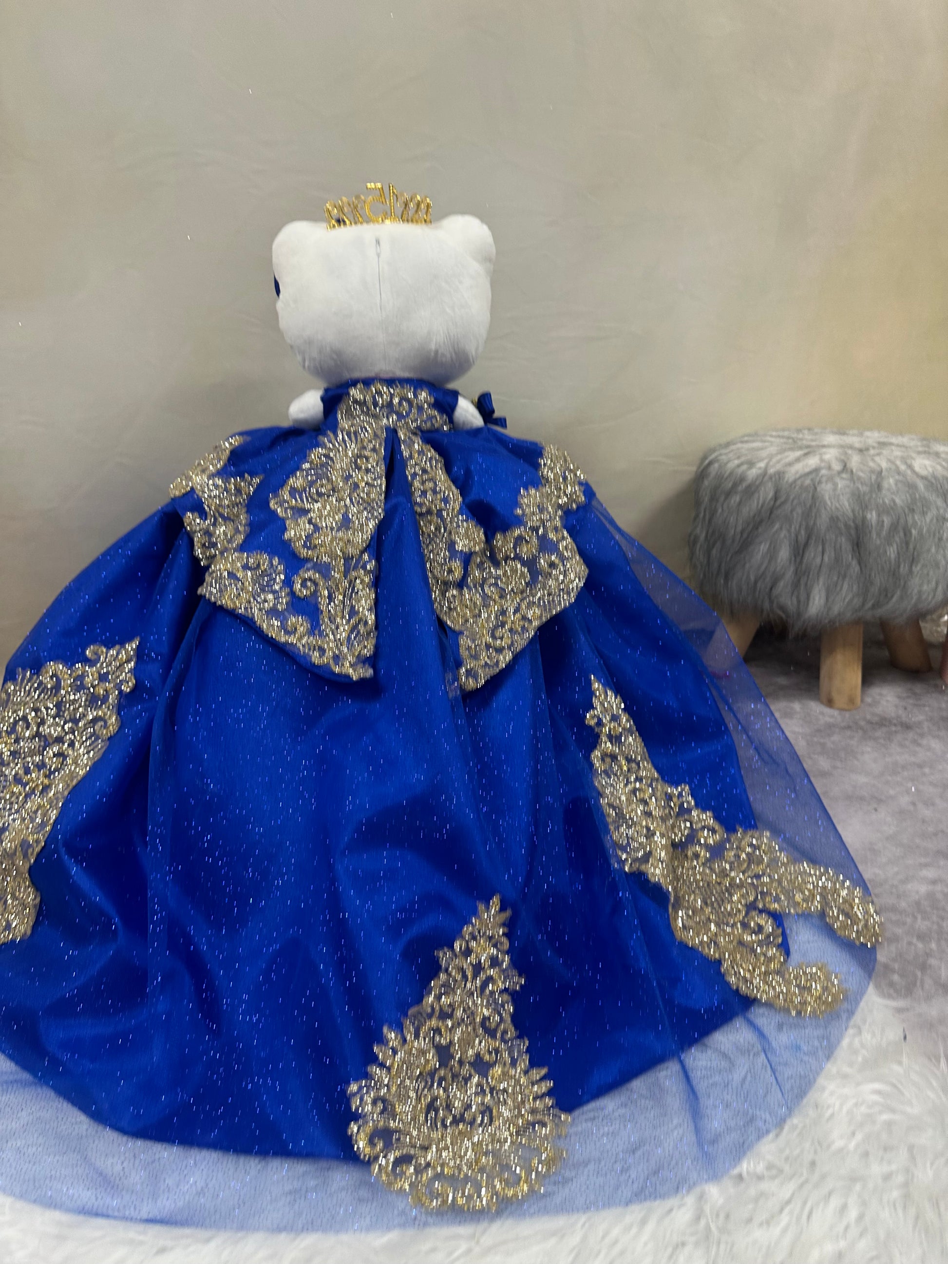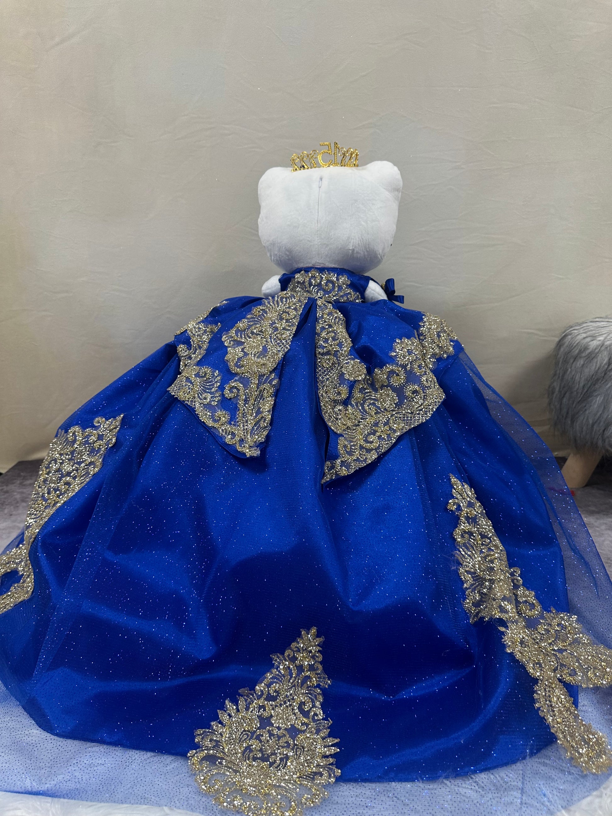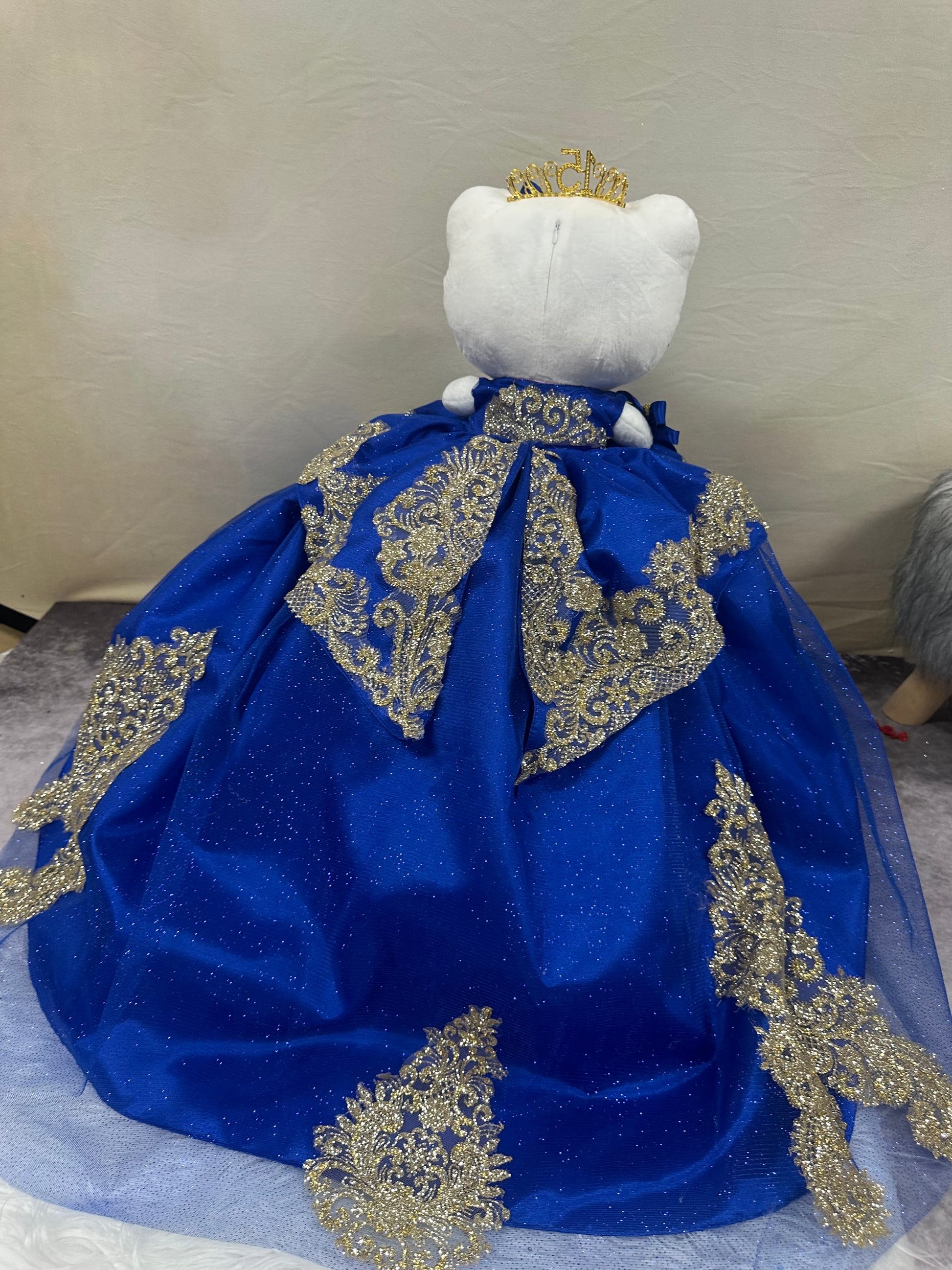 This Hello Kitty Quinceanera dress features a custom design with royal blue tulle and gold appliques. The intricate detailing adds a touch of elegance to any Quinceanera celebration. With its unique design and high-quality materials, this dress is perfect for making a statement. Made for a one-of-a-kind Quinceanera experience.