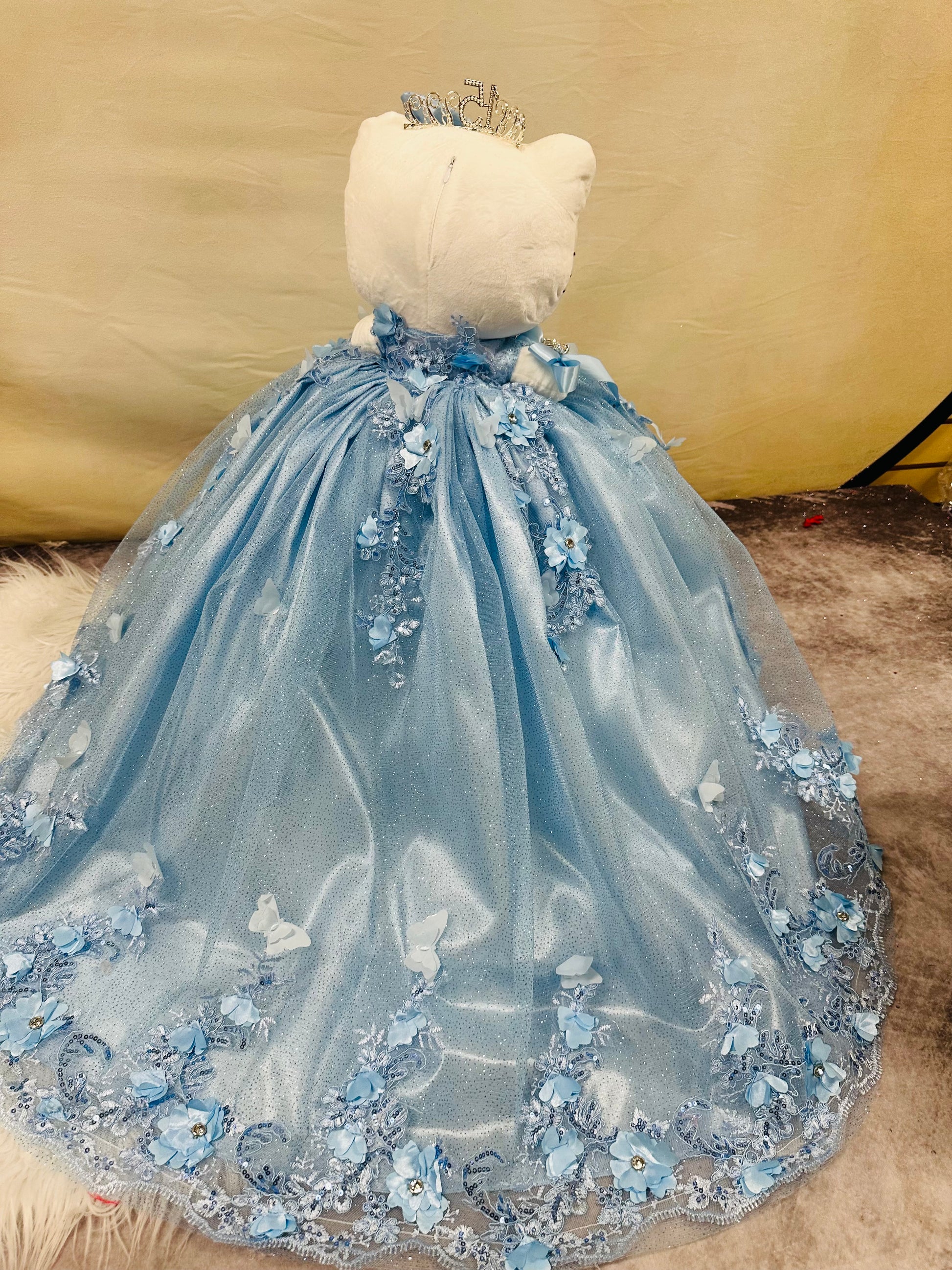 This custom Hello Kitty QUINCEAÑERA last doll is a unique addition to any celebration. Its intricate 3D lace flower design adds a touch of elegance and charm, making it a perfect keepsake for the special day. Add a touch of whimsy with Hello Kitty to create memories that will last a lifetime.