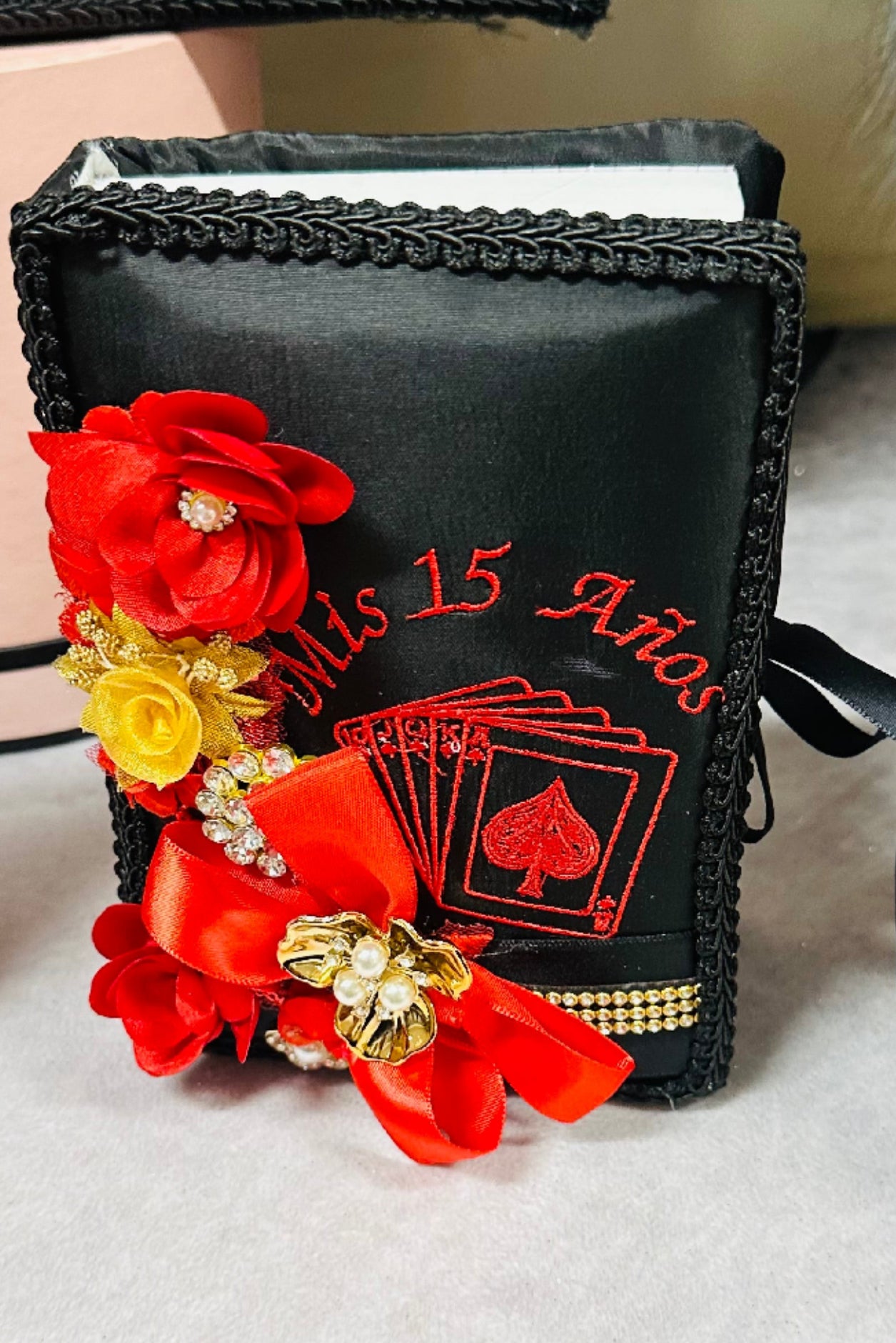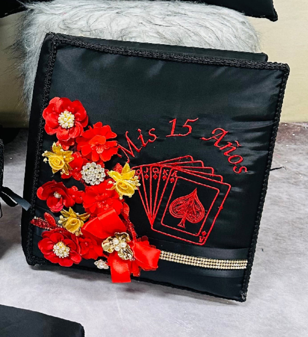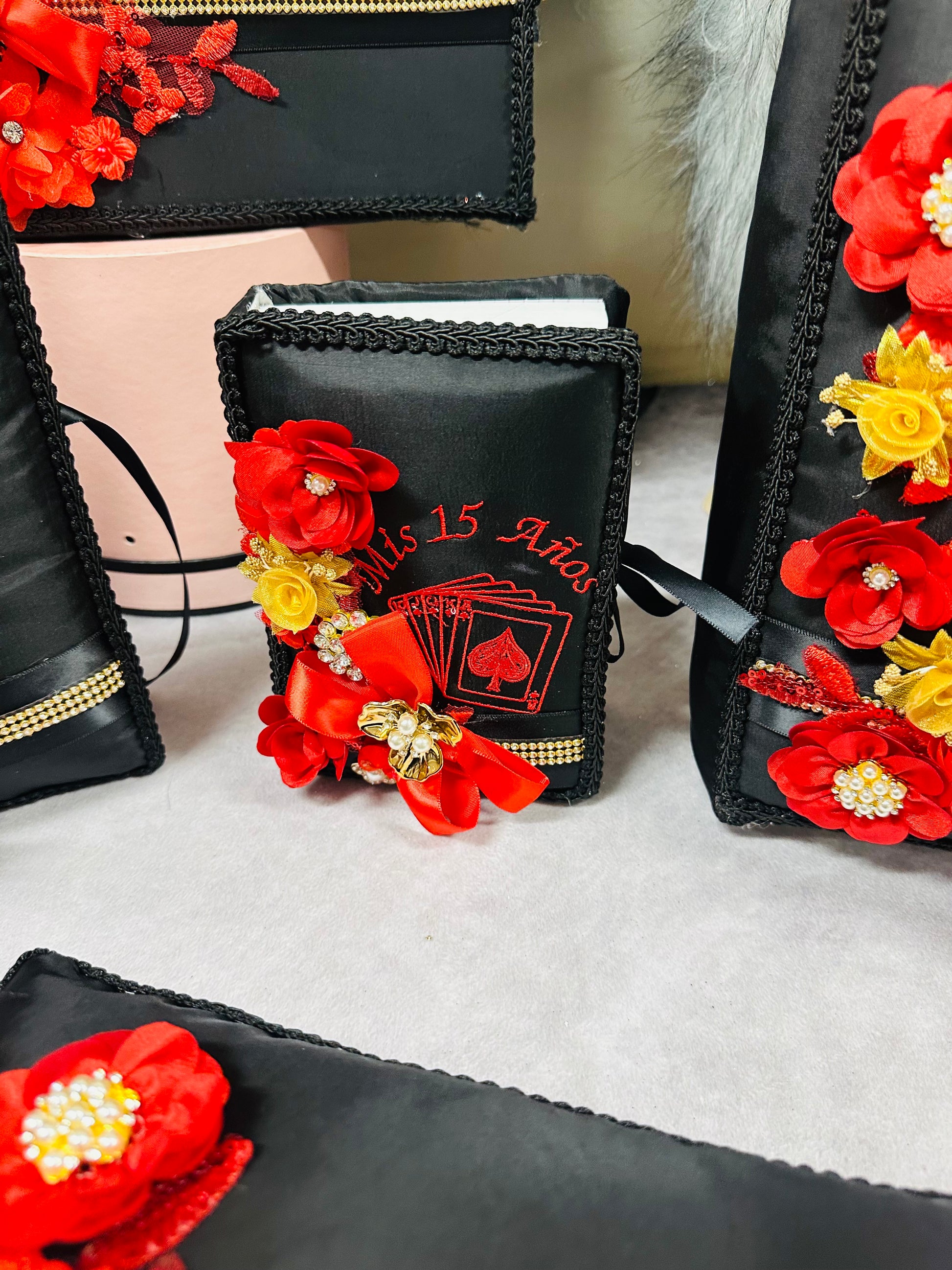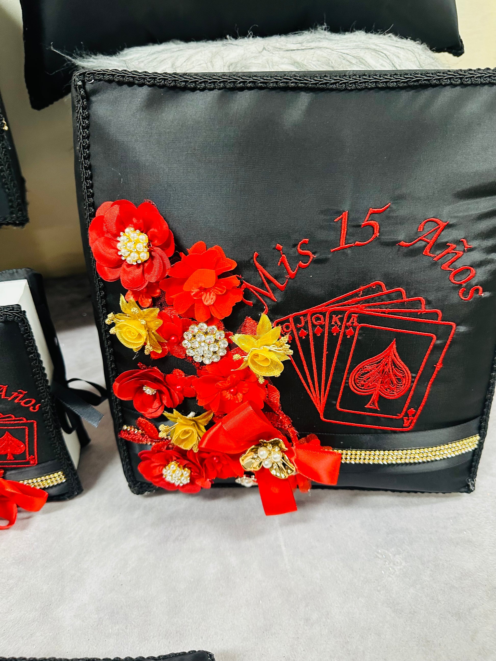 This Quinceañera pillow set comes with everything you need for a perfect celebration. The 3D flower wonderland theme adds a touch of elegance and the set includes a photo album, guest book, Bible, money box, ceremony pillow, and crown pillow. Available in any color to match your event.