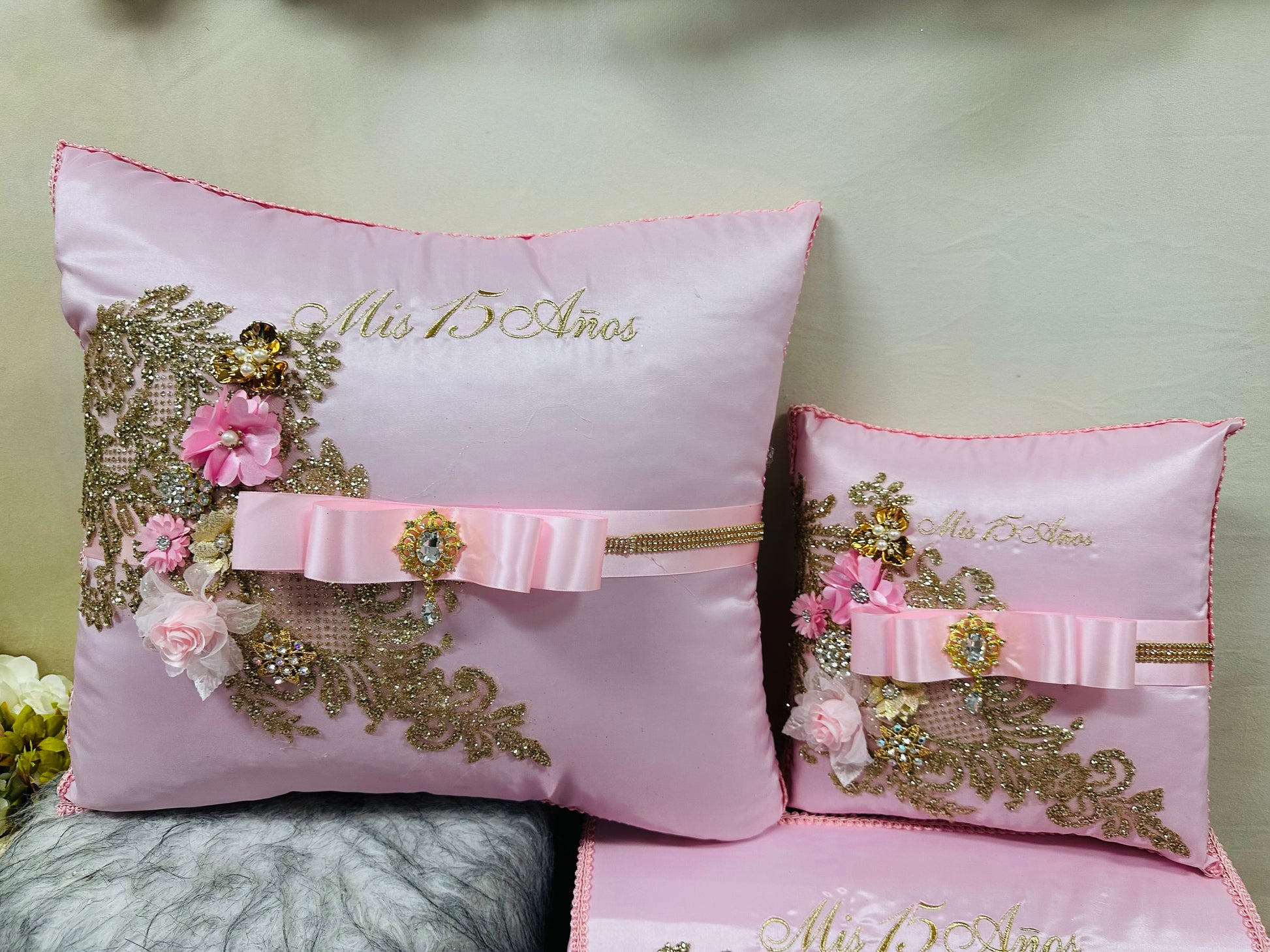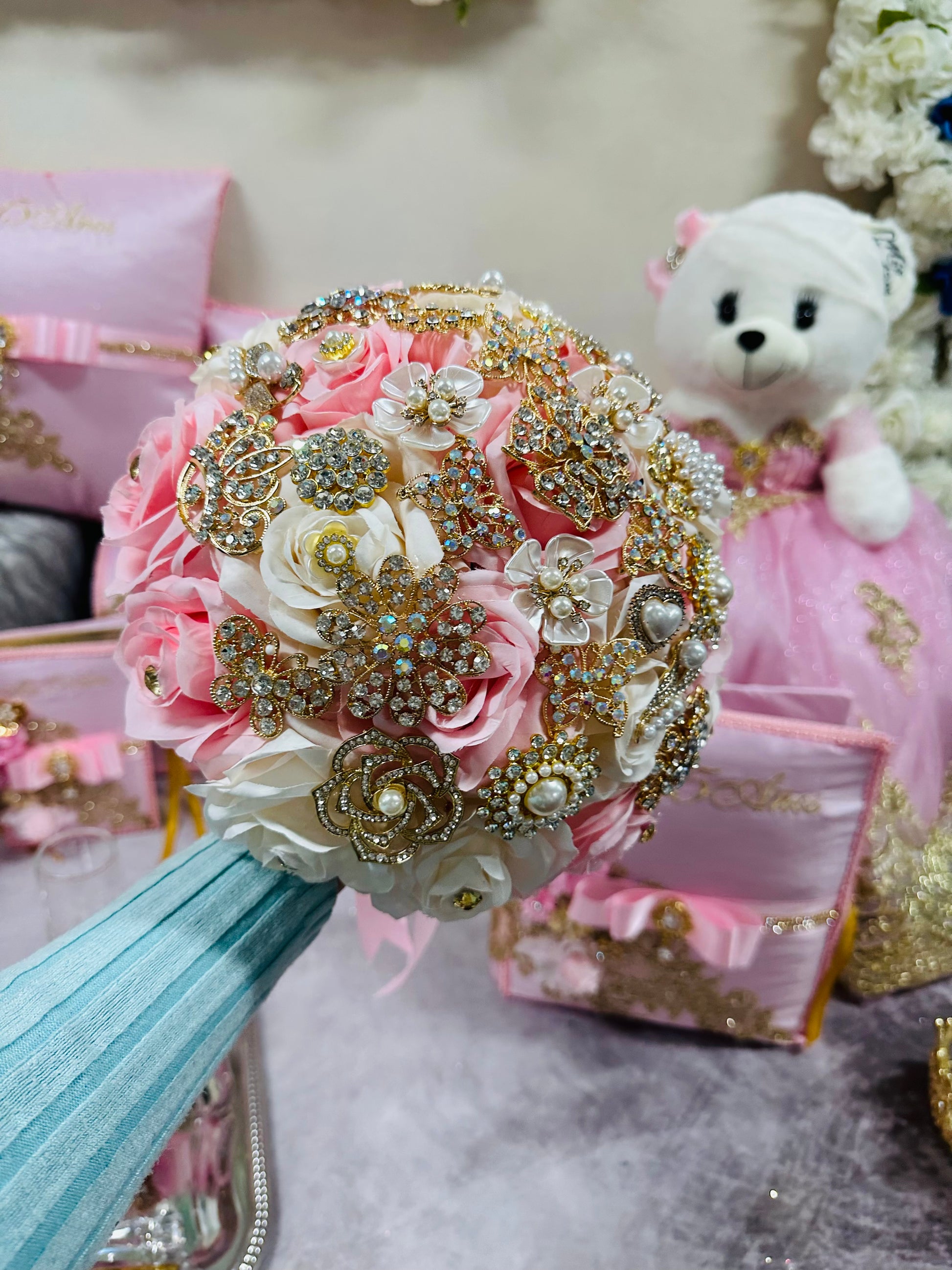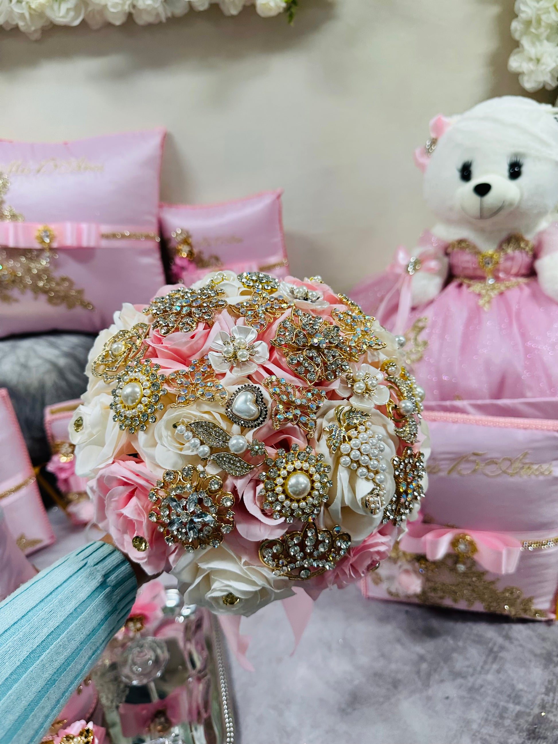 The Quinceañera set includes a decorative pillow set available in a variety of colors, allowing for customization to match specific themes. It also features a custom Teddy bear, enhancing the celebratory atmosphere while providing a tangible keepsake from a significant cultural milestone.