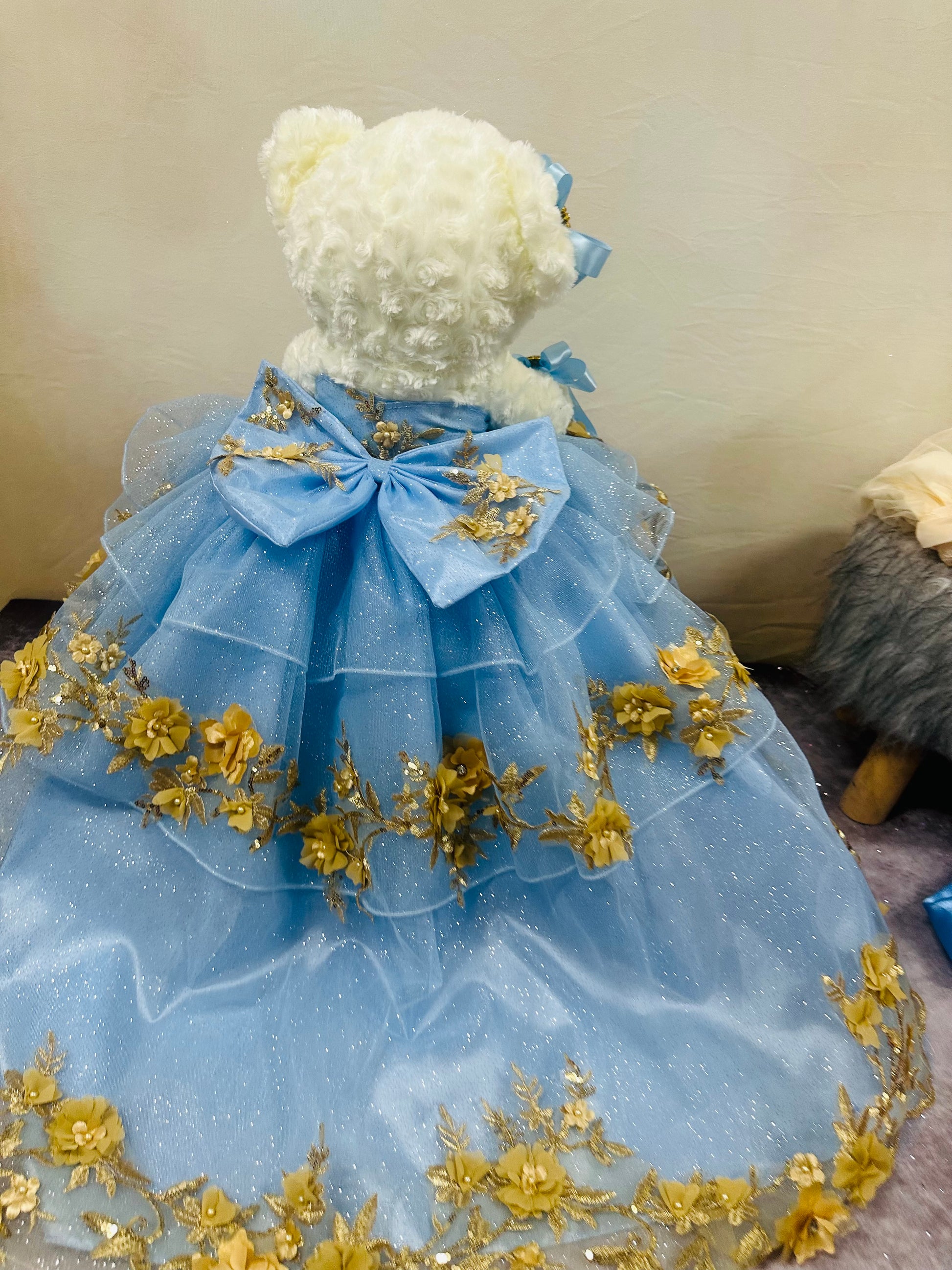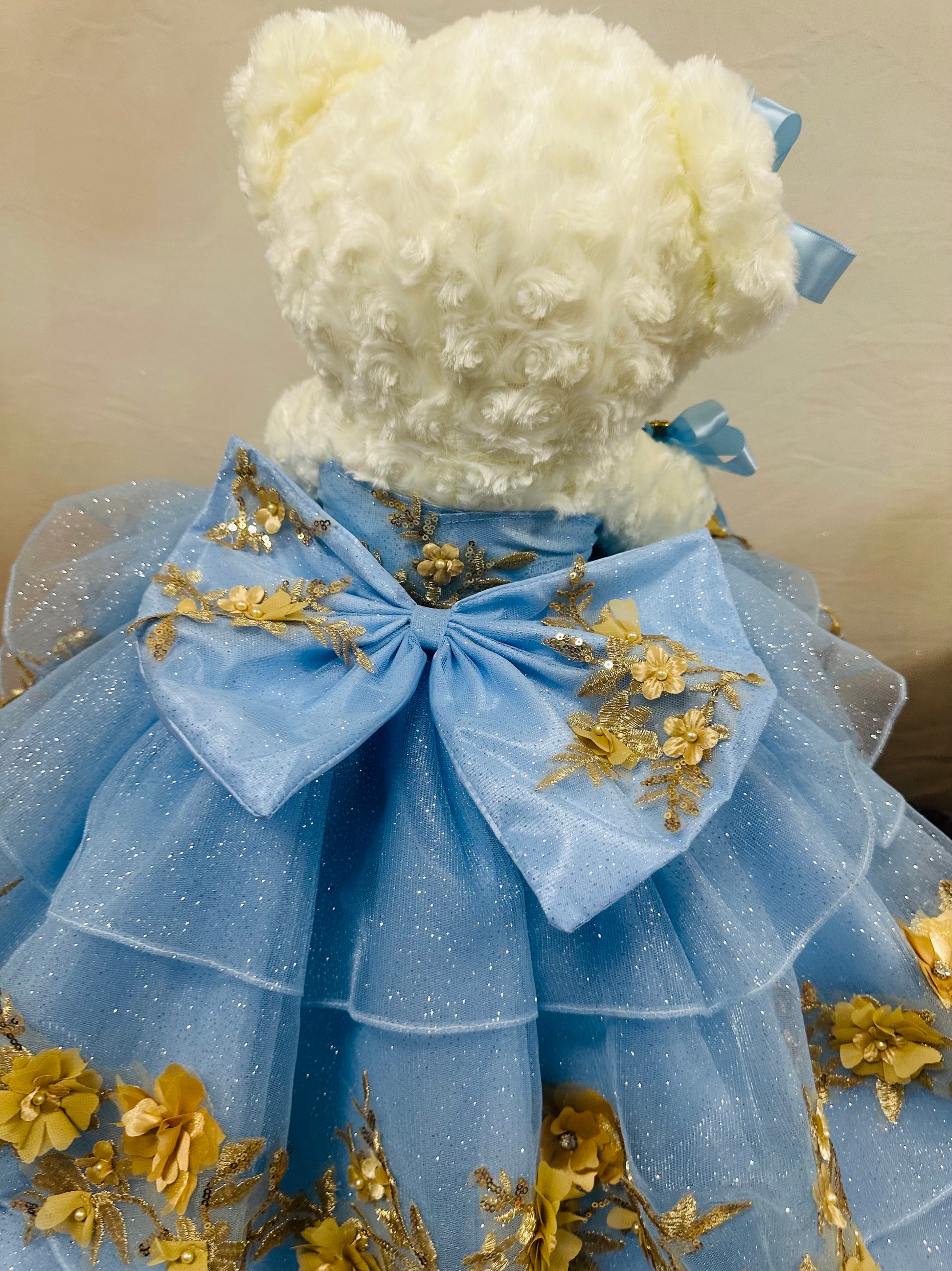 This custom teddy bear is the perfect addition to any quinceañera celebration! Measuring 23 inches tall, it can be made in any color to match your event's theme. Personalize your festivities with this one-of-a-kind keepsake.