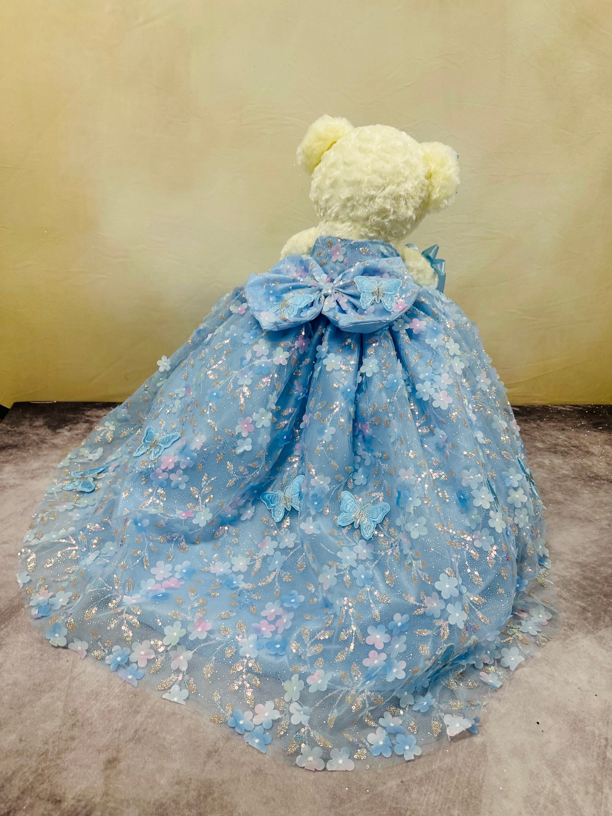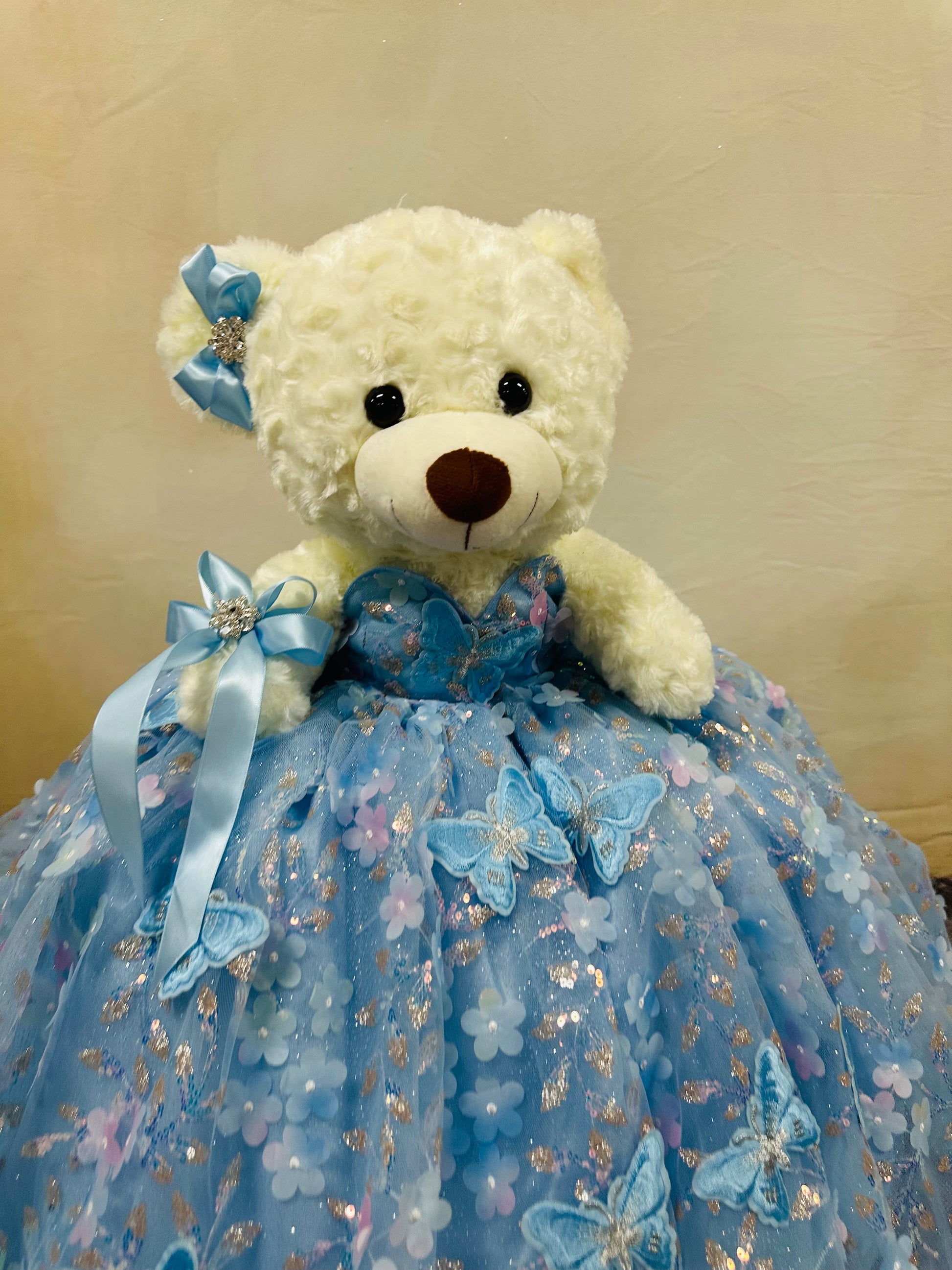 This custom teddy bear is the perfect addition to your quinceañera celebration. Available in any color and featuring 3D lace butterflies, this 22" tall bear is sure to be a cherished keepsake. Order now to make your special day even more memorable.